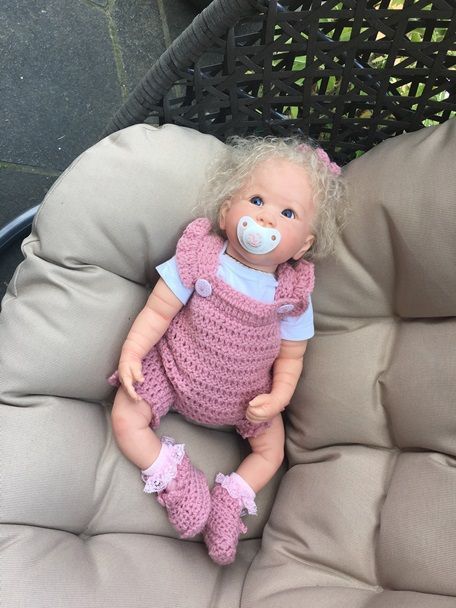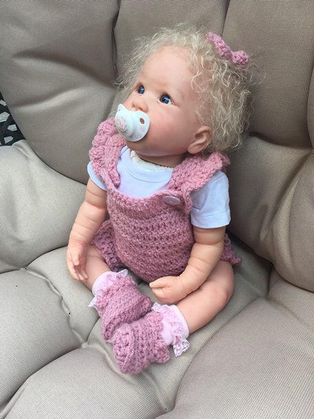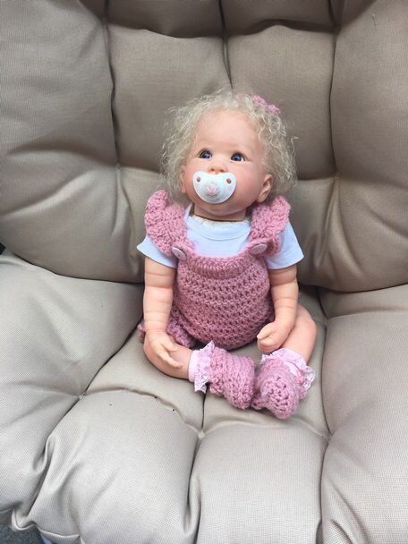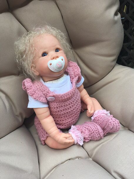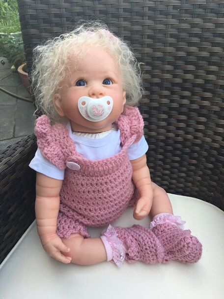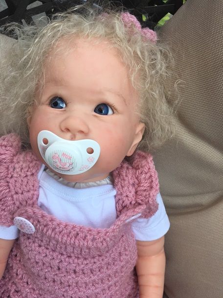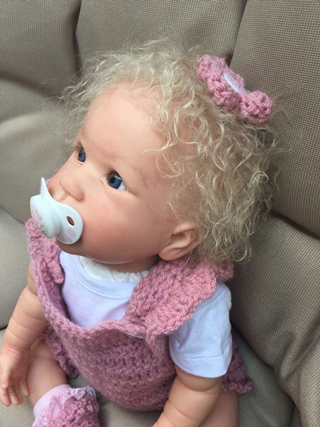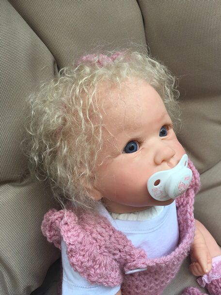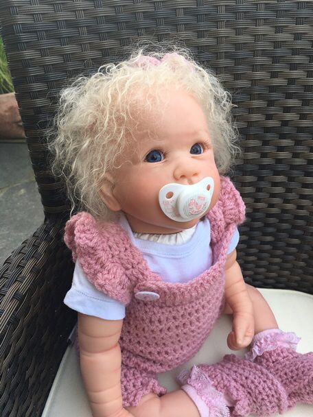 Ich bin Eliah, ein Reborn Toddler und ich entstand aus dem Bausatz Ellen von Linda Murray. Ich bin 60 cm gross und 3650 Gramm schwer und ich rieche noch nach Baby. Mein Lockenkopf wurde gerootet mit hellblondem HQ Mohair microgerootet, (1-2Häärchen pro Stich) deshalb kann man mich bedenkenlos kämmen. Ich habe blaue Lauschaer Kristallaugen und dezent gezeichnete Augenbrauen und braune Echthaarwimpern.