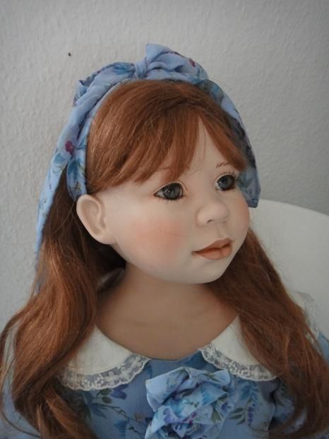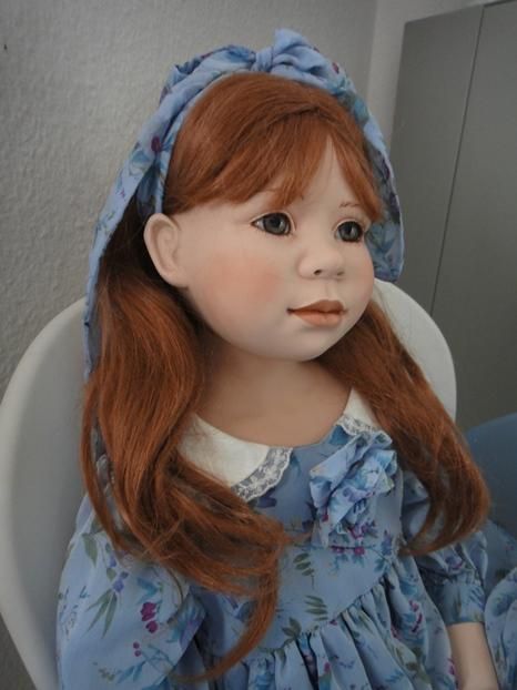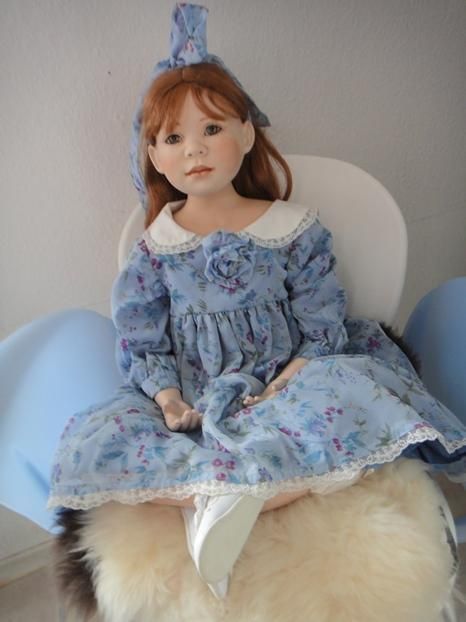 In ihrem blauen Kleidchen und ihrem dazu passenden Haarband, ist sie bereit für den Sonntags-Spaziergang, mit ihren Geschwistern. Sie ist mit ihren 97cm, ein grösseres Puppenkind von der Künstlerin Christine Orange und ist sehr dekorativ.