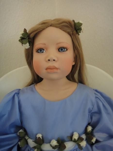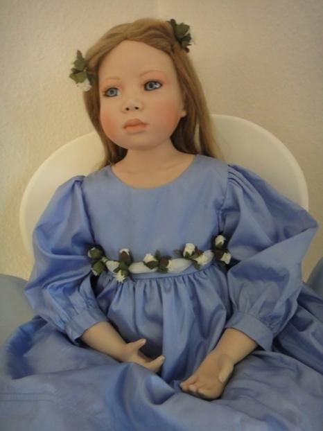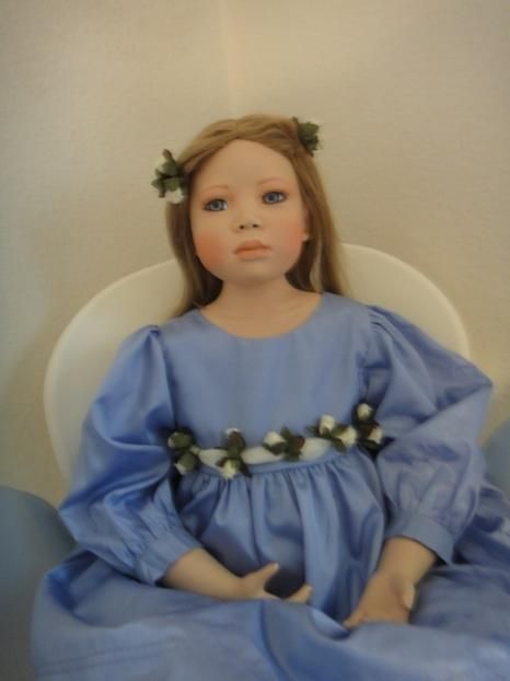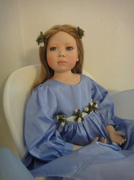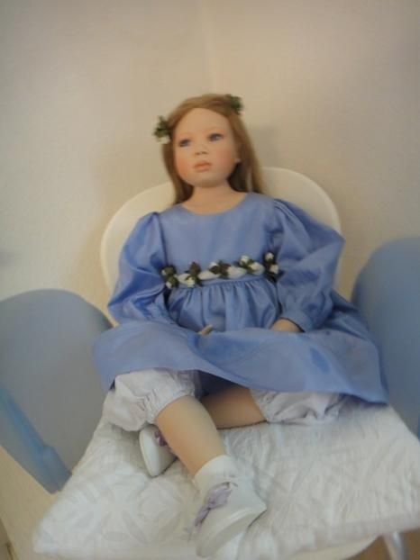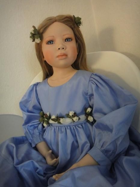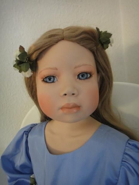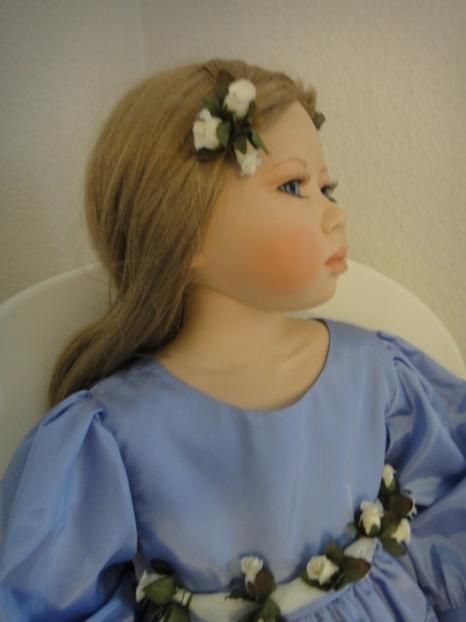Ihr blaues Taftkleidchen mit ihrem Rosengürtel liebt sie über alles. Ihre Haare sind links und rechts mit Stoffrosen zurück gebunden, damit man ihr schönes Gesicht mit den blauen Augen (Lauscha) sehen kann.