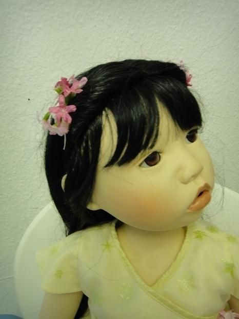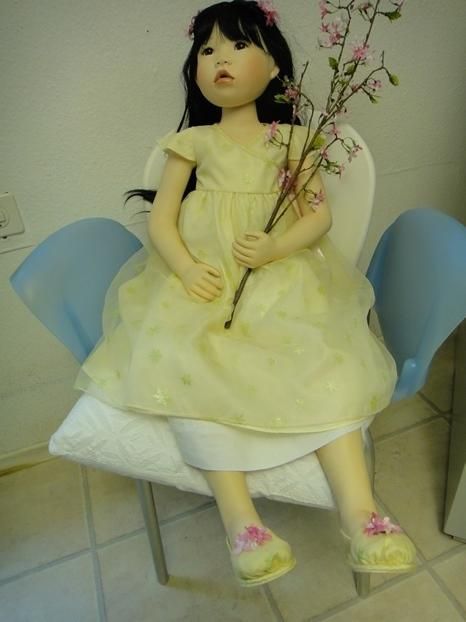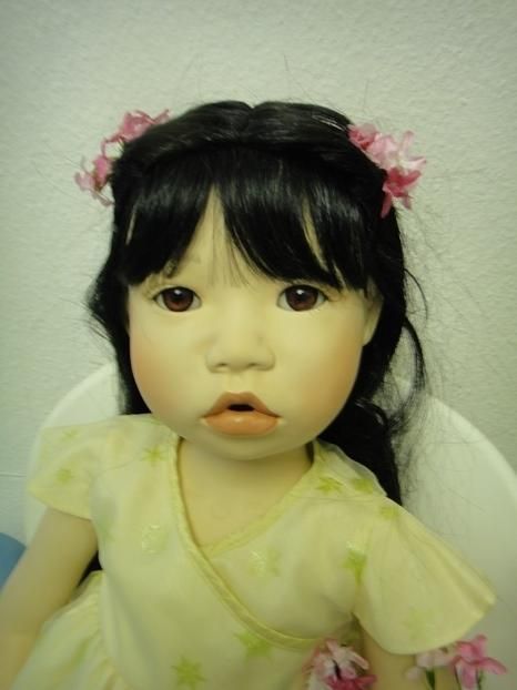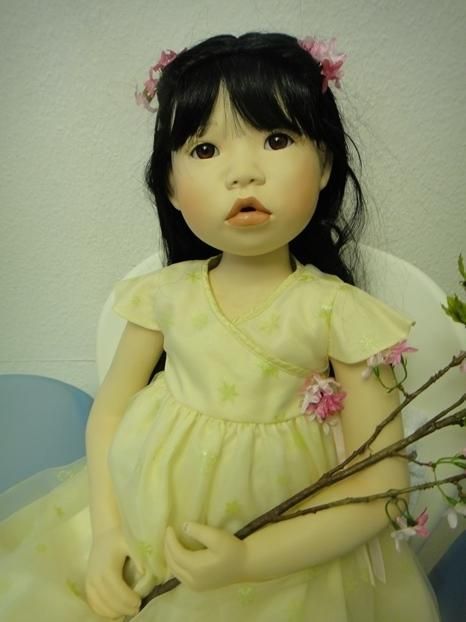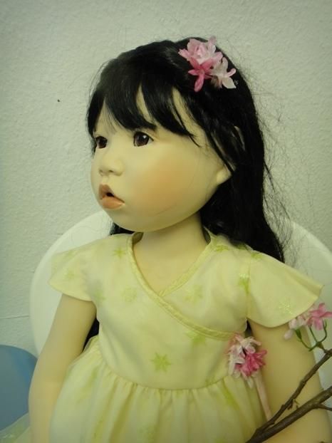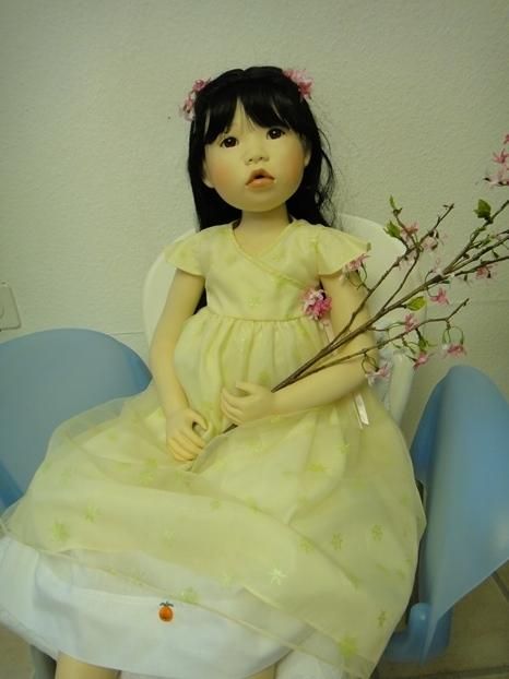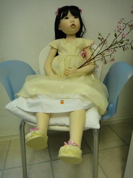 Meine Suki, Prototyp ist 96 cm gross und eine Sitzpuppe. Ihre Arme und Beine sind hochmodelliert. Sie kann gut hochgeschnittene Ärmel an ihren Kleidchen, tragen. Sie ist ein süsses, asiatische Puppenmädchen. Sie schaut mit ihren mandelförmigen Augen und dem Sabbermündchen, staunend in die Puppenwelt.