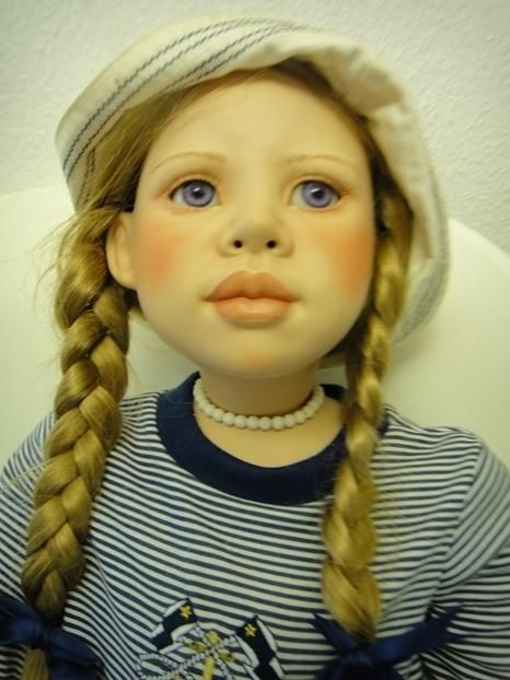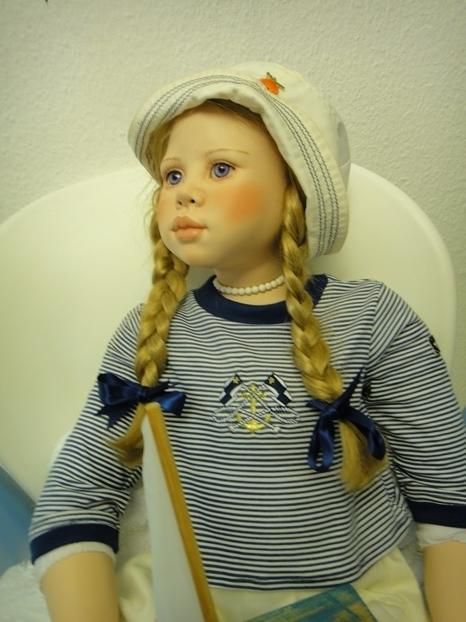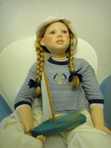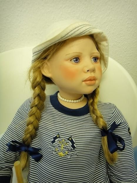 Meine Tara USA , ist 91 cm gross & eine Sitzpuppe. Tara, ist ein richtig süsses Matrosenkind. Ihre Haare sind zu Zöpfen geflochten, sie schauen listig unter der Mütze heraus. Sie hat ein weiss/blau gestreiftes T-Shirt an, auf dem ein weiss/goldenes Wappen gestickt ist.