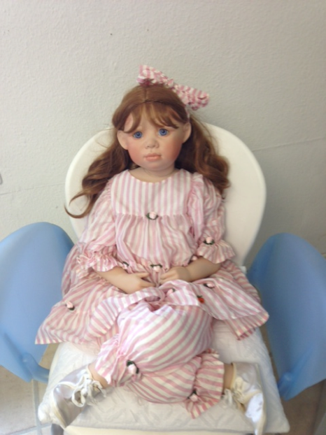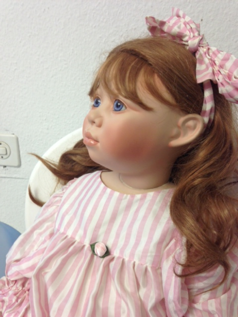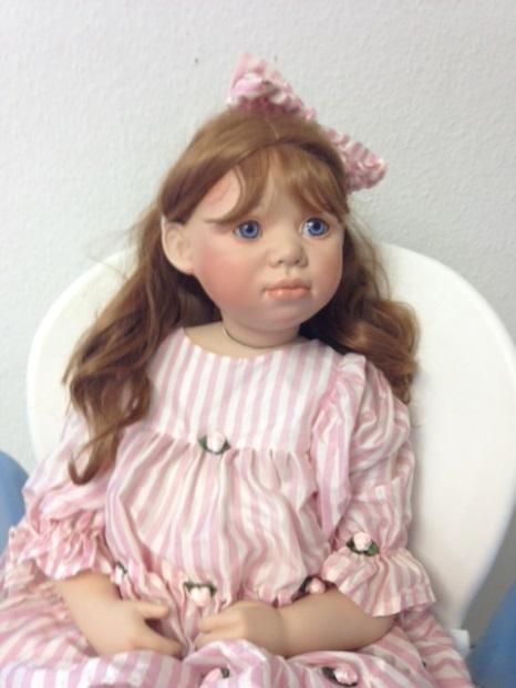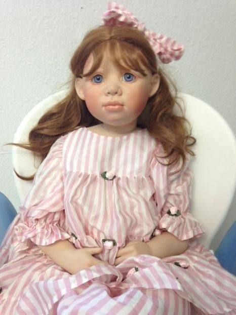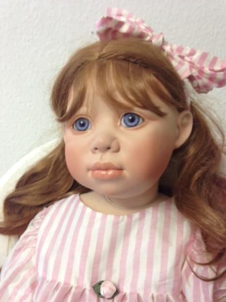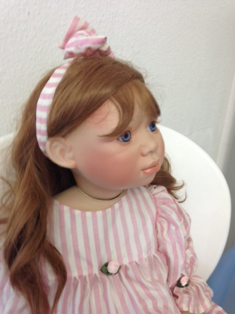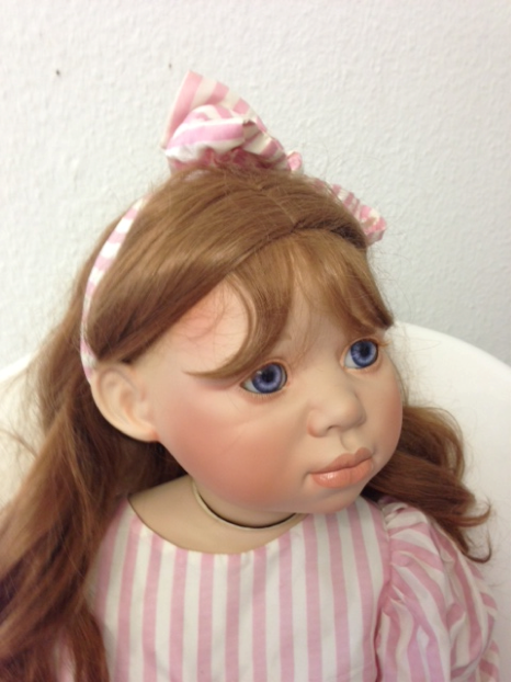 Tamsin, ist eine limitierte Puppe von Christine Orange. Sie wohnte lange Zeit zusammen mit ihren Schwestern Tamsin (Original und Tamsin Prototyp), bei mir im Puppen-Zimmer, sie ist mittlerweile in ein neues, schönes Zuhause umgezogen. Tamsin limitiert, ist die USA Version und sie ist stolz, dass sie die persönliche Unterschrift, zusätzlich in ihrem Zertifikat hat. In ihrem langen rosa-weiss gestreiften Seidenhemd und ihrer rosa-weiss gestreiften Seidenhose, ist sie ein ganz schickes Mädchen. Ihr Haarband ist passend zum restlichen Outfit. Sie trägt stolz ihre Kette mit glänzenden rosa Steinen.