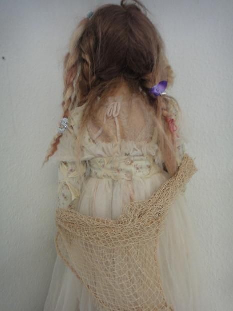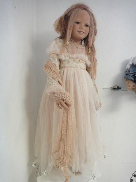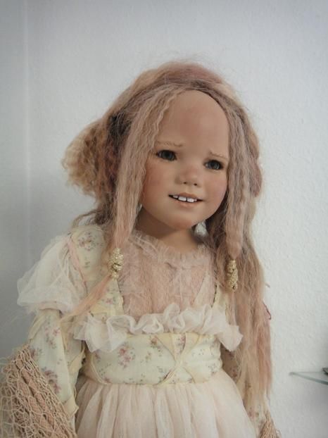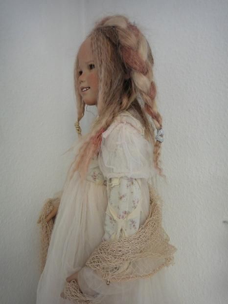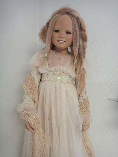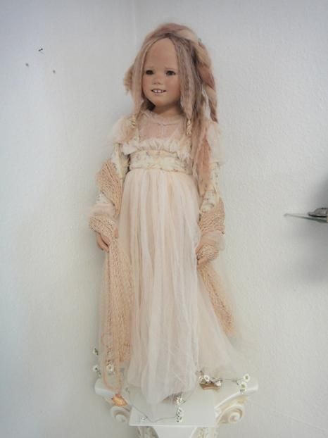 Aleta, von A. Himstedt ist ein Atlantiskind. Aleta, ist 92 cm gross. Sie hat eine semi handgeknüpfte Perücke aus Menschenhaar, mit eingearbeitetem mehrfarbigen Haarzopf. Sie hat Oberarmgelenke & mundgeblasene Augen.