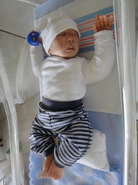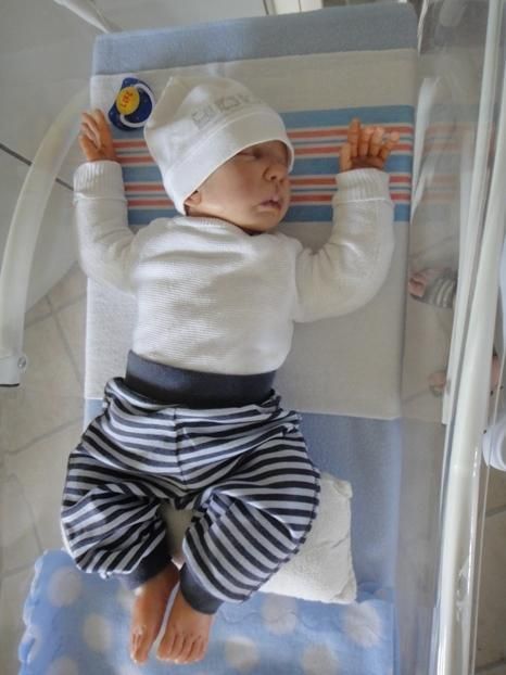 Ich habe für ihn extra ein Original Bettchen aus Plexglas, wie man es von der Säuglingsstation kennt, angeschafft, darin kann man das Rebörnchen von allen Seiten betrachten.