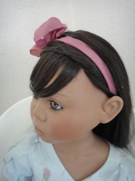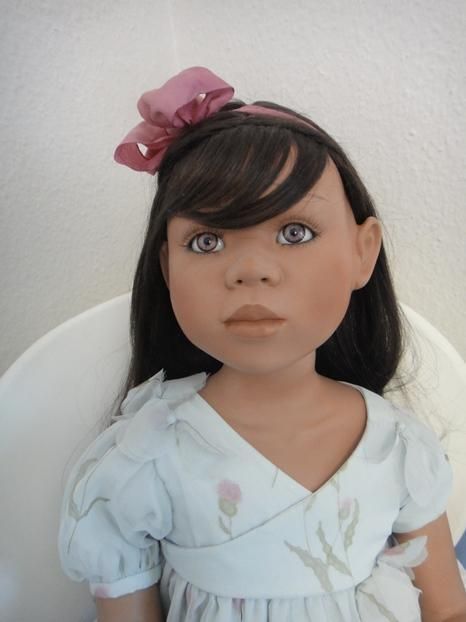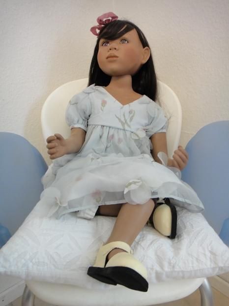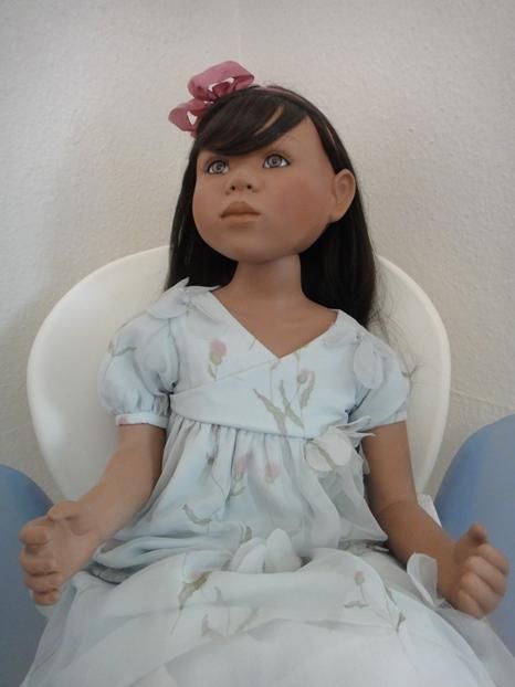 Meine Nina dunkel ist 97 cm gross & eine Sitzpuppe. Nina dunkel ist ein zurückhaltendes Puppenmädchen. Sie hat ein türkisfarbenes Kleid aus zwei Lagen gearbeitet, an. Unterkleid ist aus Baumwolle, das Überkleid ist aus transparenter Organza. Beide Teile sind mit Disteln in Pink- und Grüntönen, bedruckt.