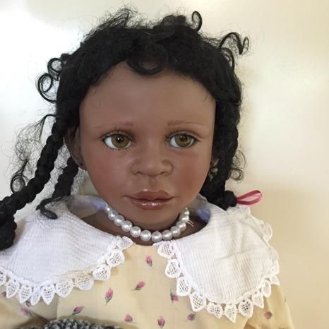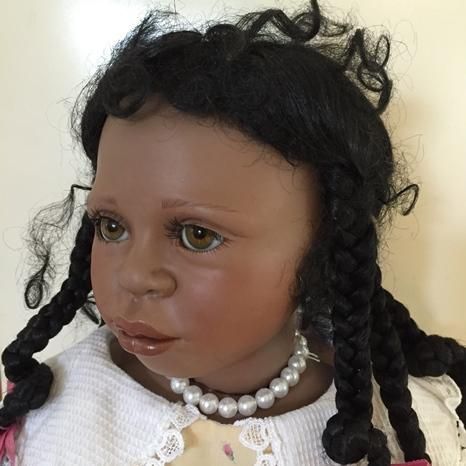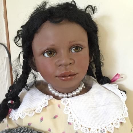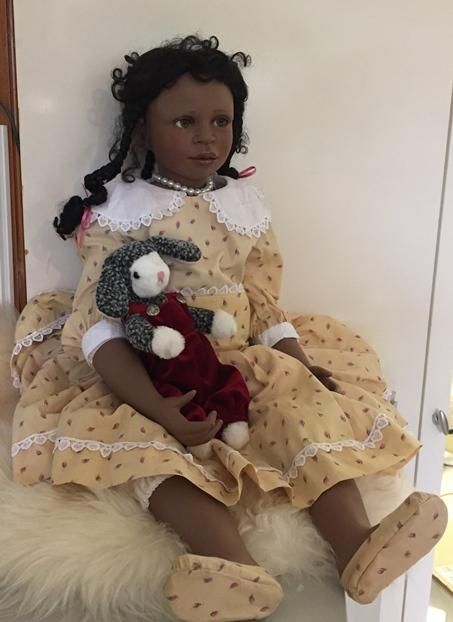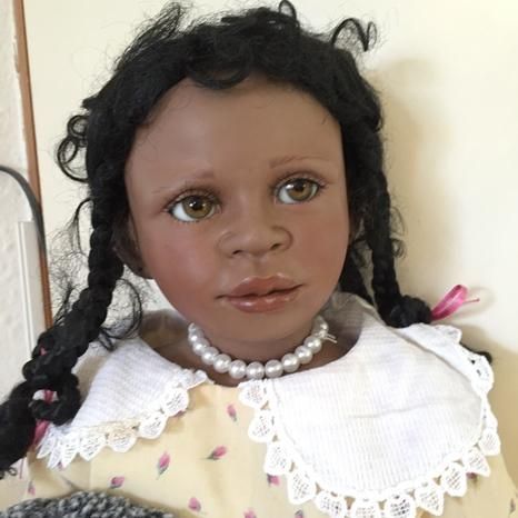 Ihr dunkler Teint und die schwarzen Haare die zu neckischen Zöpfchen zusammen gehalten werden, sind einfach zuckersüss. Mit dabei ist immer ihr Hase, der auch speziell ist wie sie.
