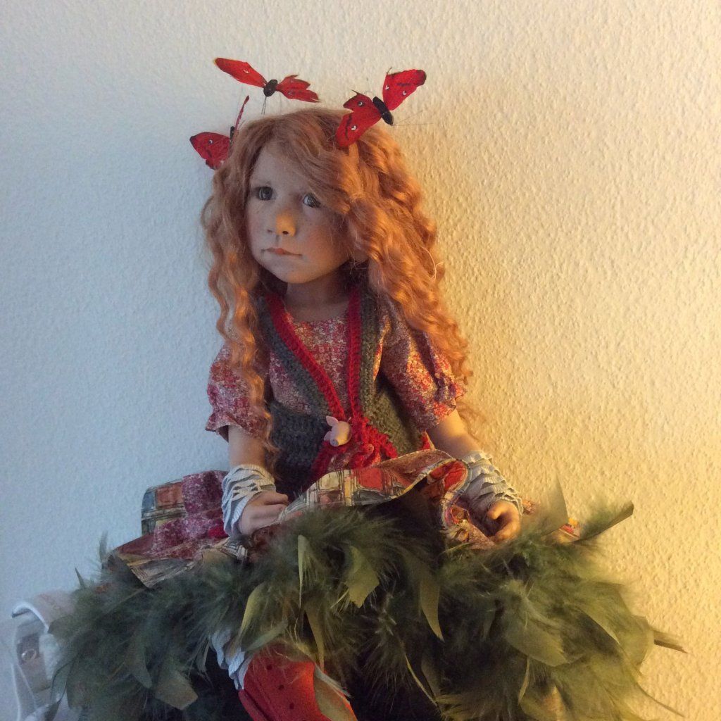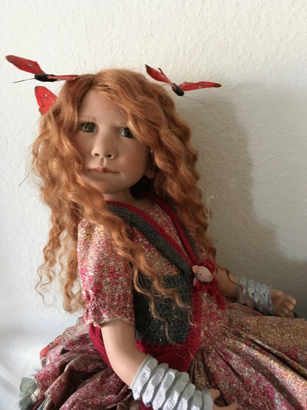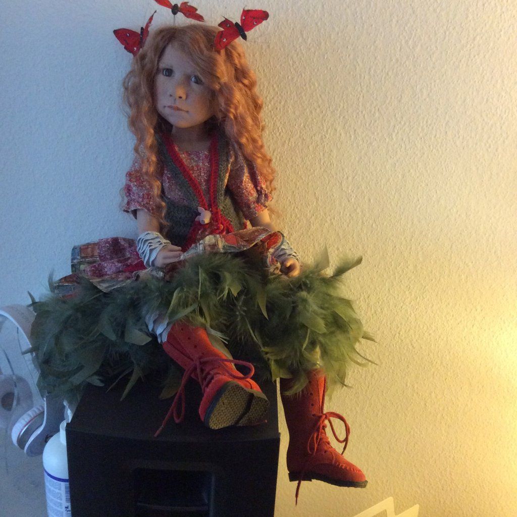 Mein Kleidchen ist aus vielen, vielen Federchen. Besonders stolz bin ich auf meine roten Schnürstiefel aus Wildleder. Alle finden ich habe einen frechen Blick für mich ist das ganz normal und mein Puppenmami liebt den Blick an mir.