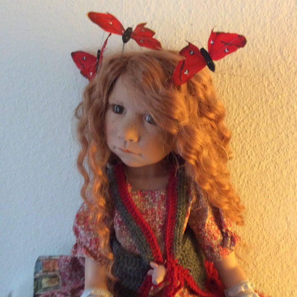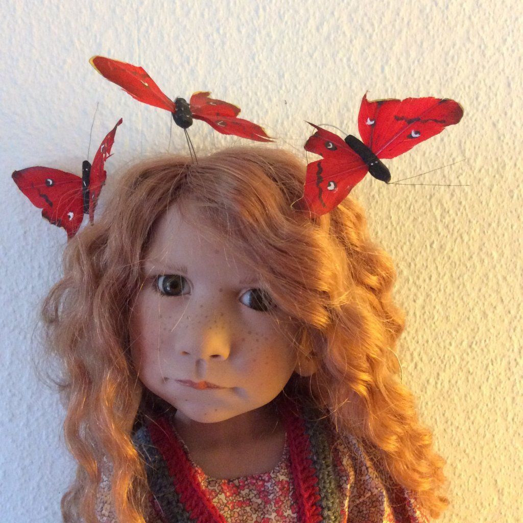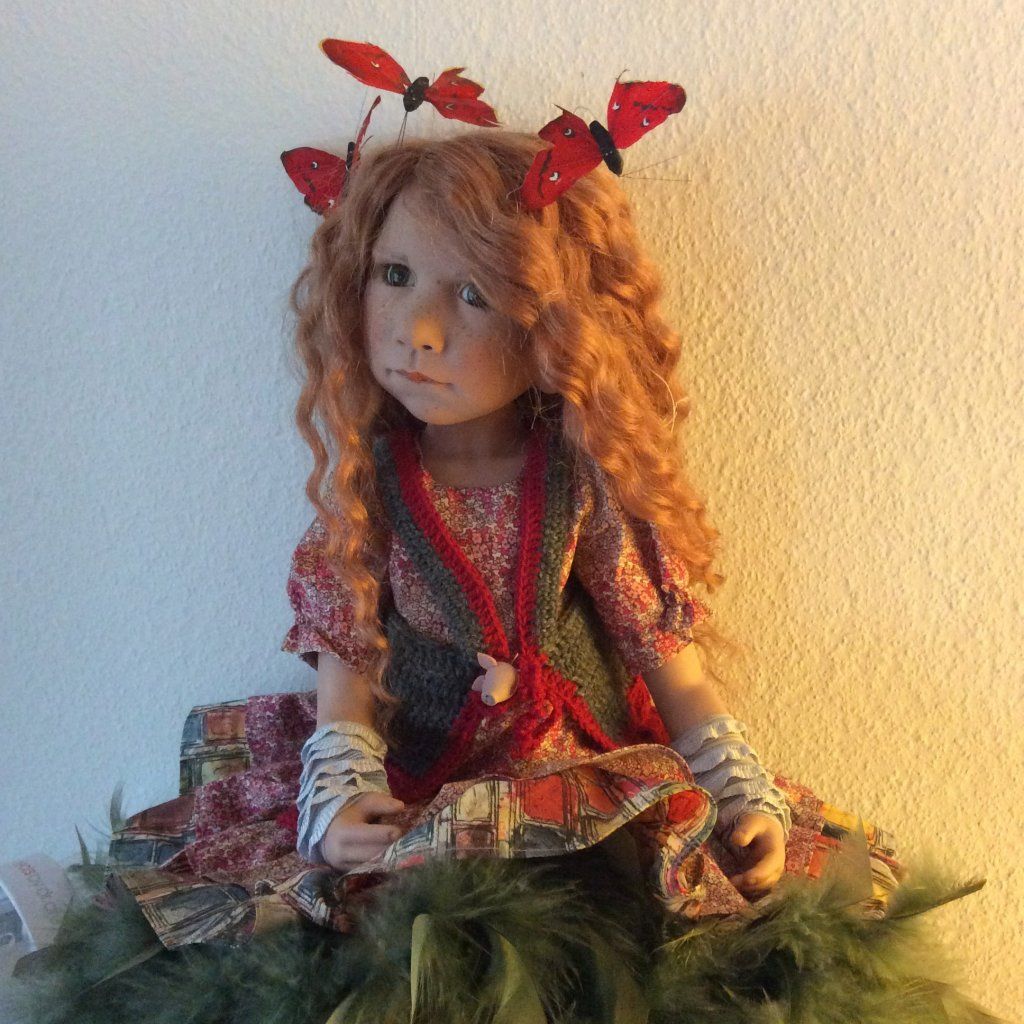 Mein Kleidchen ist aus vielen, vielen Federchen. Besonders stolz bin ich auf meine roten Schnürstiefel aus Wildleder. Alle finden ich habe einen frechen Blick für mich ist das ganz normal und mein Puppenmami liebt den Blick an mir.