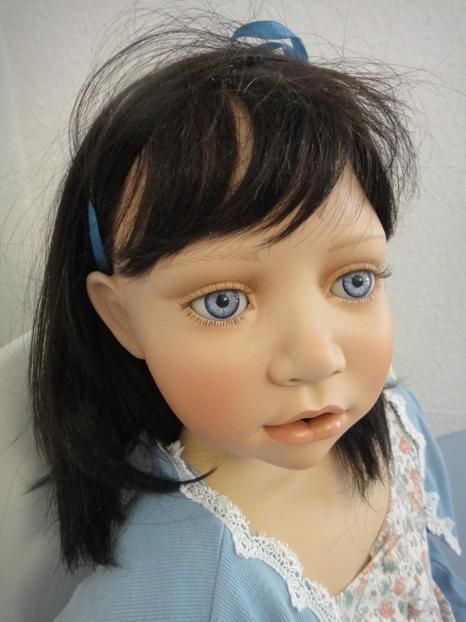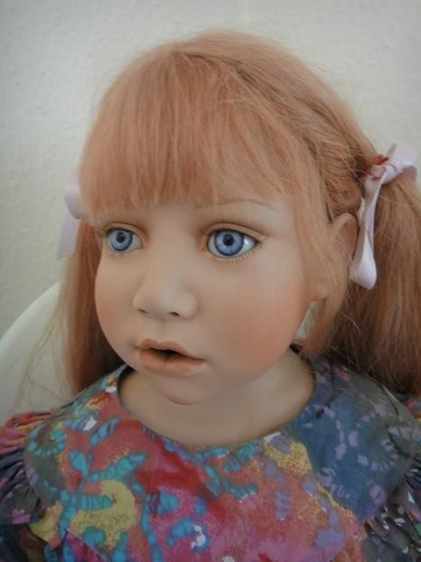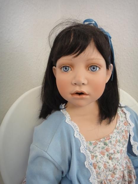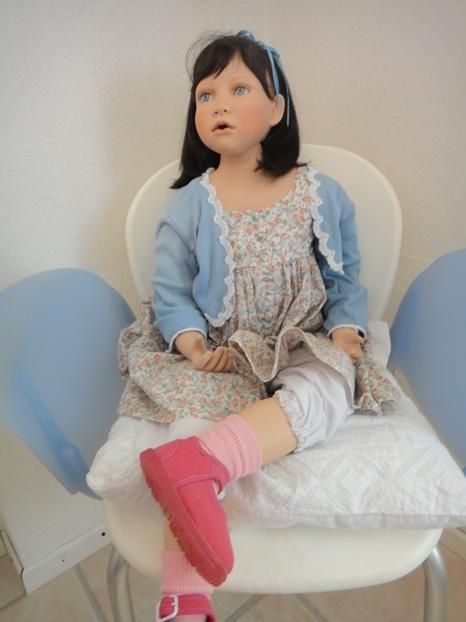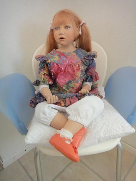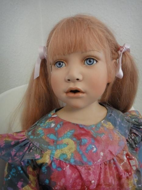 Meine Natalie`s sind 97 cm gross & Sitzpuppen. Sie haben einen geöffneten Mund. Eine Natalie trägt ihr wunderschönes Original Baumwollkleid mit altweissen Untergrund & einem Millefleursdruck, in lila-,grün-, rost-,& Gelbtönen. Darüber trägt sie eine Jacke im Bolerostil.