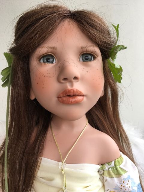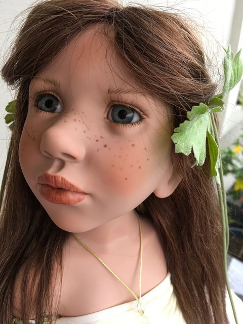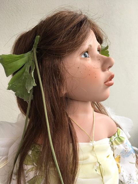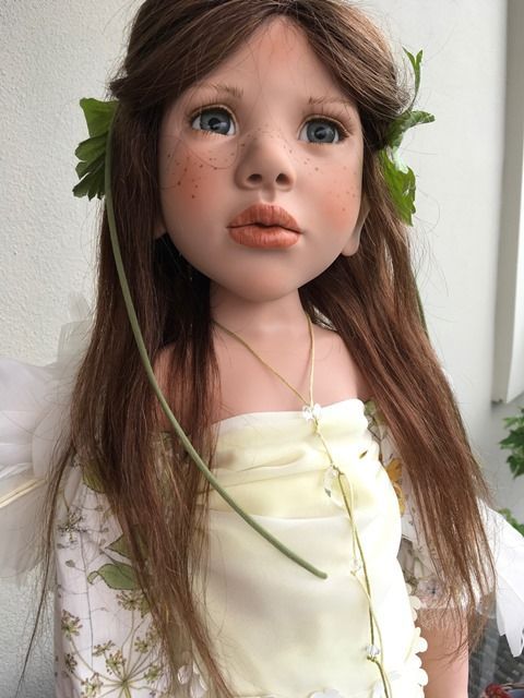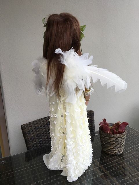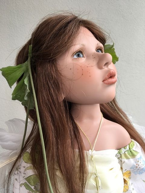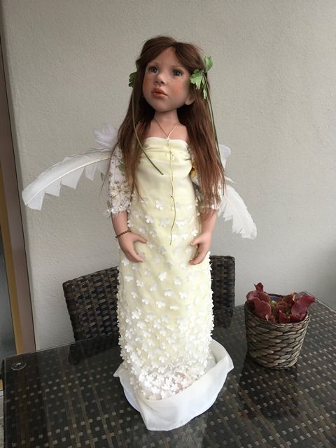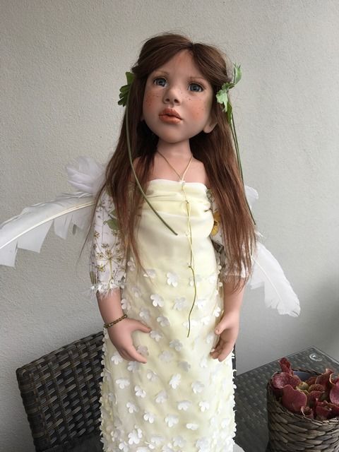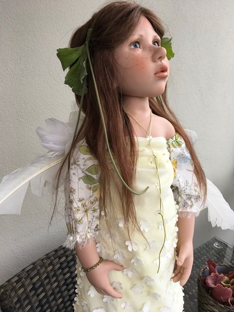 Carlina Acàulis, hat blaugraue mundgeblasene Glasaugen, aus Lauscha und sie ist 70 cm gross.Sie hat braunes, langes Echthaar, das beidseitig mit zwei Blumenspangen zurückgehalten werden. Über ihrer Nase kann man gut ihre Sommersprossen sehen.Carlina Acàulis, hat ein besonders schönes Kleidchen an, das hinten geknöpft ist und ihre Flügel aus Federn sind ihr ganzer Stolz.