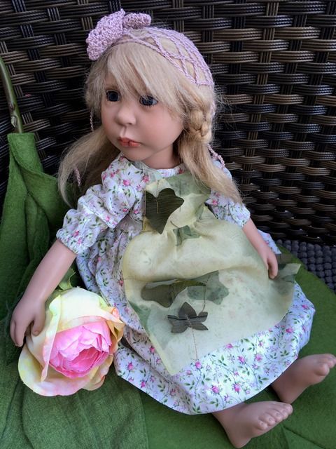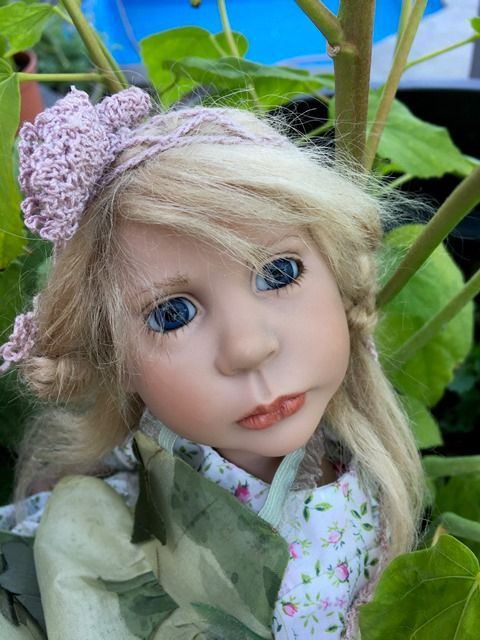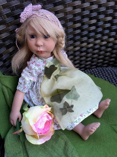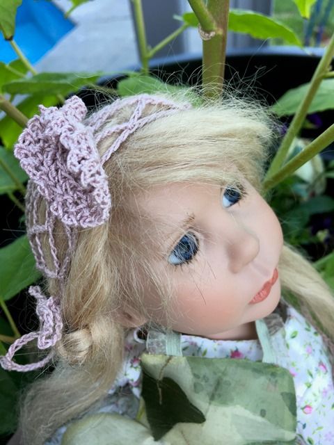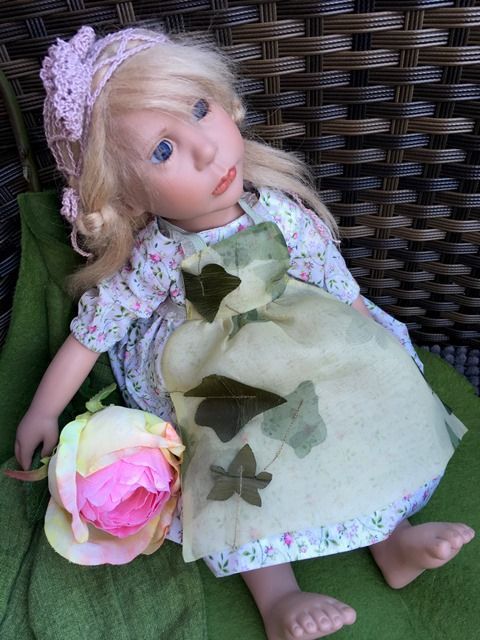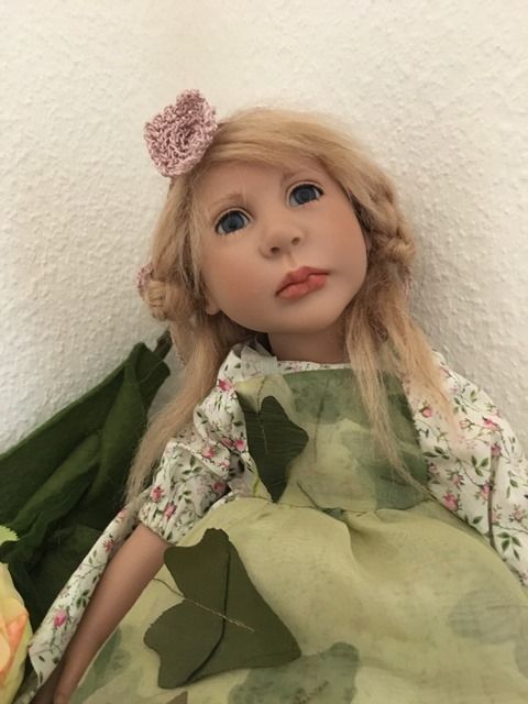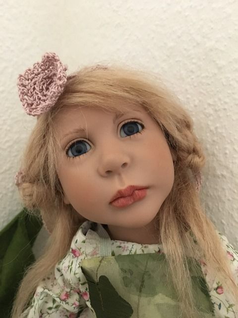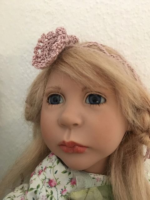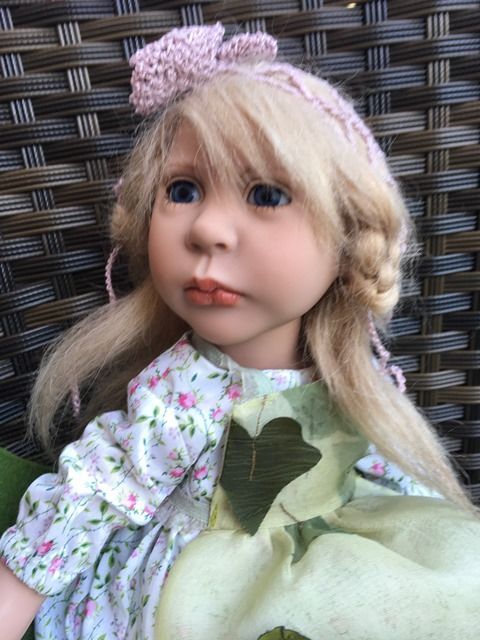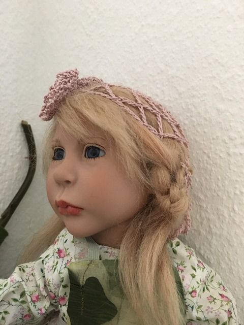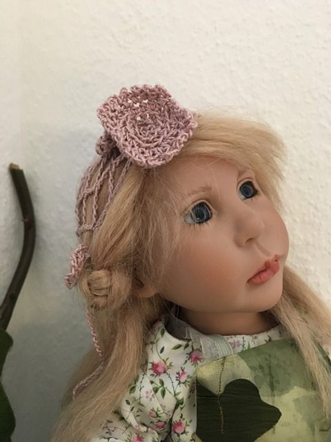 Sie hat blondes, langes Echthaar und Mohair gemischt, das sie unter einem filigran gearbeiteten Mützchen, offen trägt.