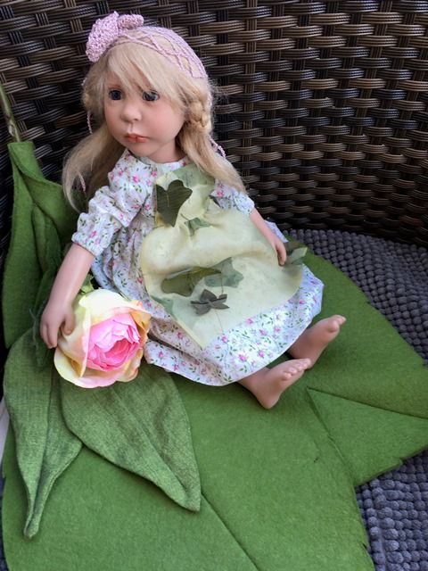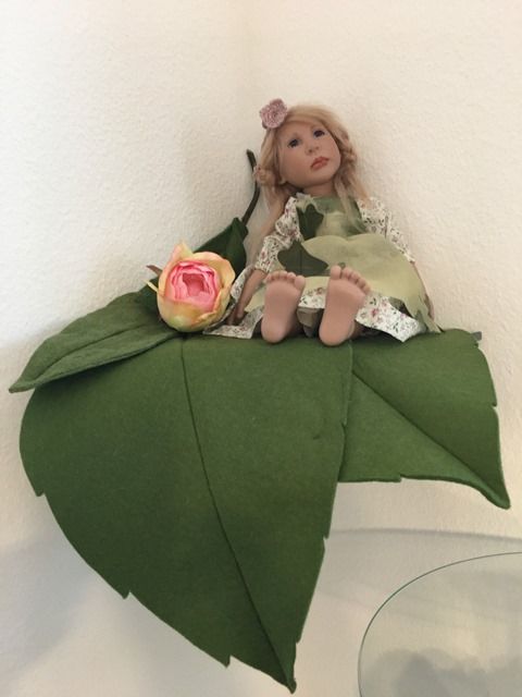 Däumelinchen sitzt auf einem grossen grünen Filzblatt, das mit einer Rosenknospe bestückt ist.