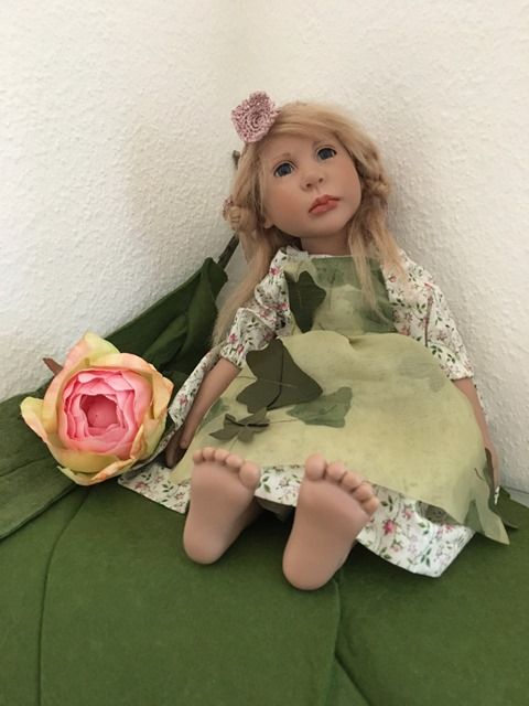 Däumelinchen hat ein geblümtes Kleidchen an, darüber ein Schürzchen aus einem feinem Stoff. Sie sitzt am liebsten Barfuss auf ihrem Blatt, ihr Outfit welches sie trägt ist exklusives Zwergnase Designs.