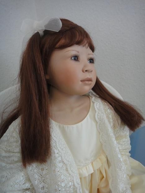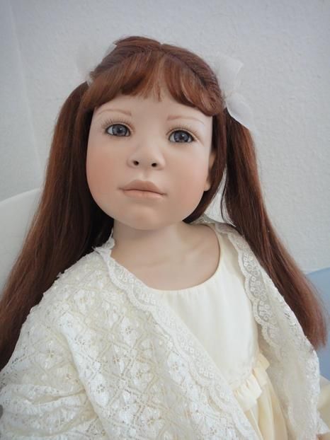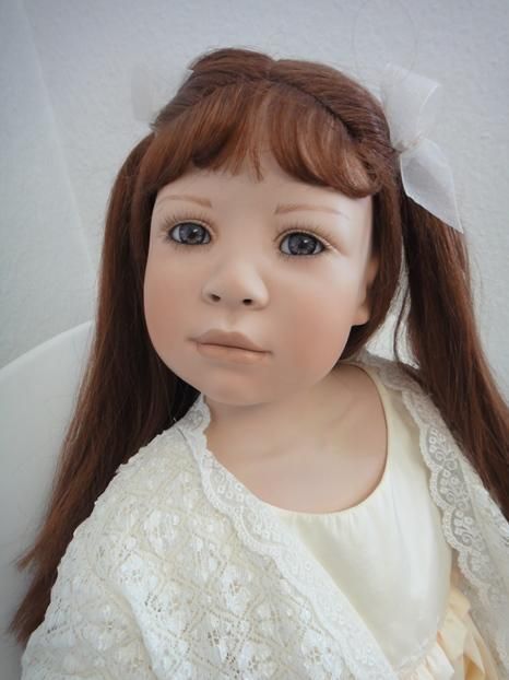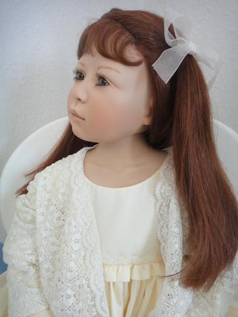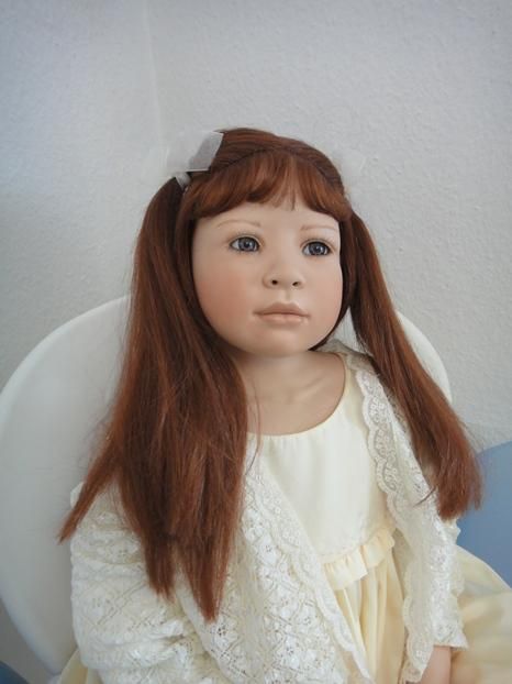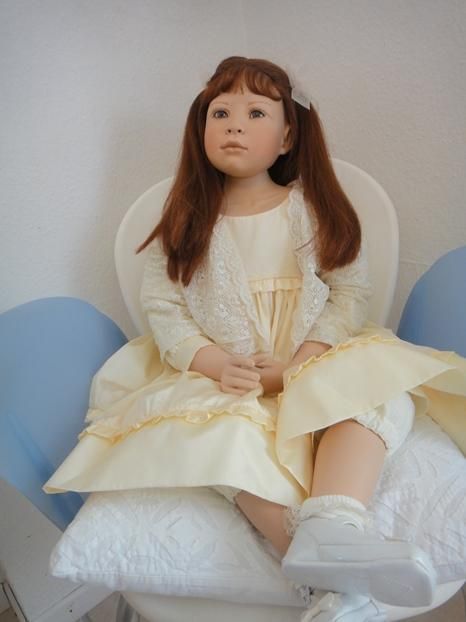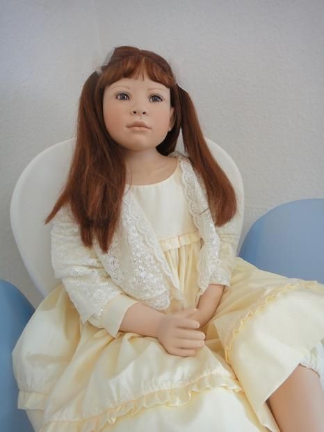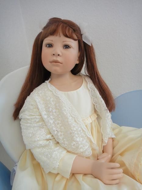 Meine Sarah ist 97 cm gross & eine Sitzpuppe. Sarah, ist ein aufgewecktes CO-Puppenkind & schaut gerne in die Kamera. Sie hat kastanienbraunes langes Haar, das mit einem vanillegelben Satinband zurück gehalten wird. Sie trägt ein gelbes Satinkleid, das aufwendig verarbeitet ist mit Rüsche & Stickerei, darüber hat sie ein Spitzen- Jäckchen an.
