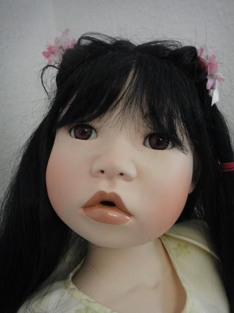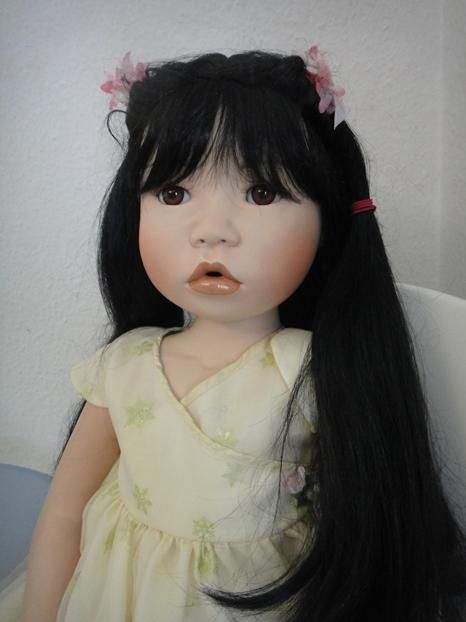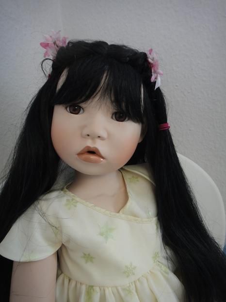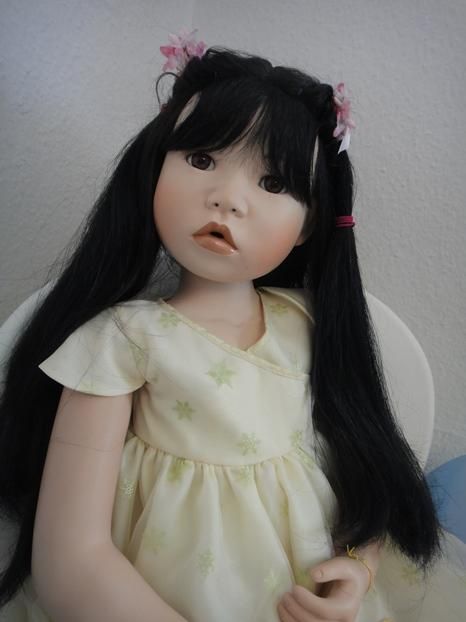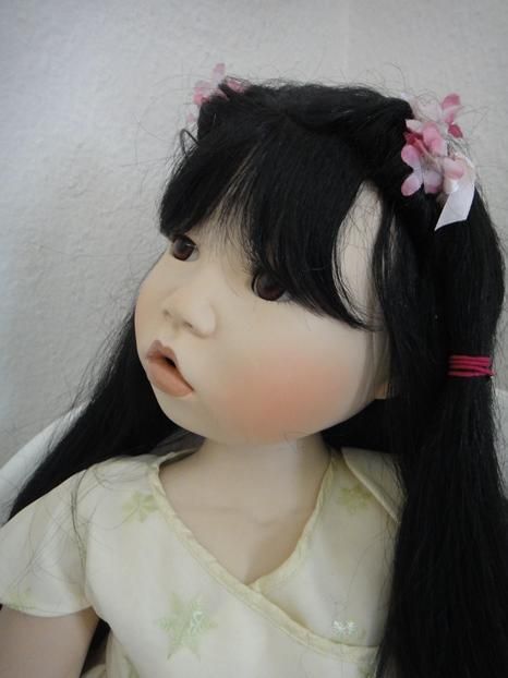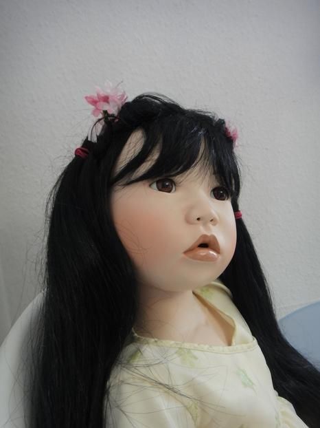 Meine Suki ist 96 cm gross & eine Sitzpuppe. Sie hat eine asiatische Hautfarbe, mandelförmige Augen, einen offenen Mund. Ihre Haare sind tiefschwarz, links und rechts zu Strähnen abgeteilt, welche mit rosa/weissen Kirschblüten Spangen gehalten werden.