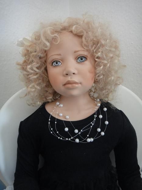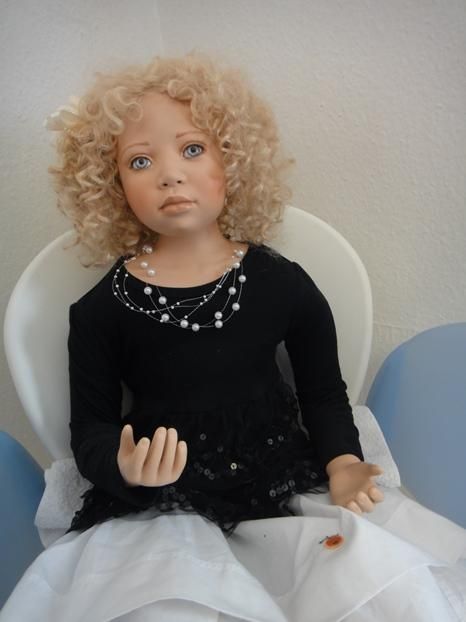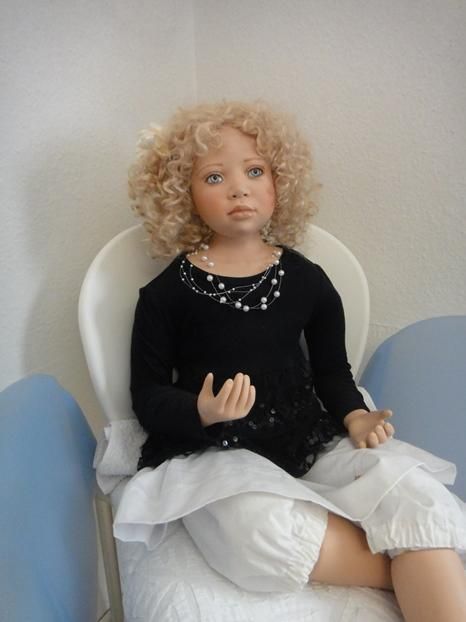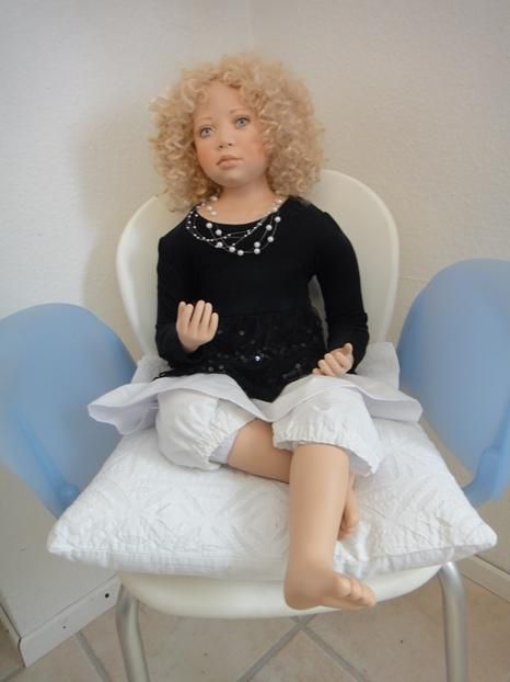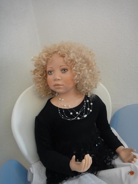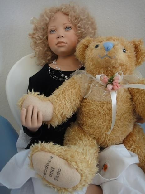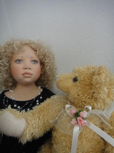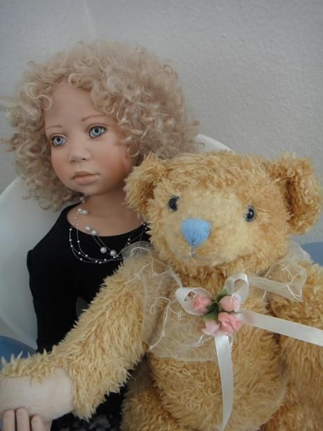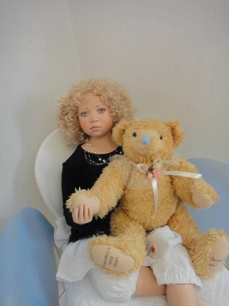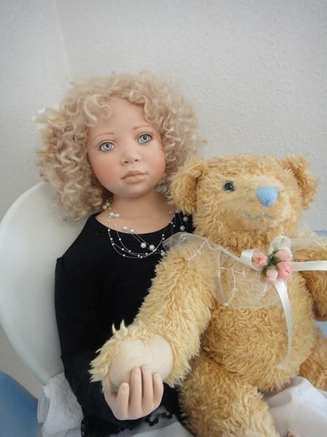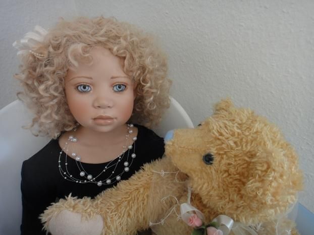 Sie hat blonde, stark gelockte Haare, dekoriert mit einer Haarspange. Ich habe Theodora ein neues Outfit angezogen, das Original hat sie gut verpackt. Auf ihren Halsschmuck ist sie besonders stolz. Sie ist in Begleitung von ihrem Teddy Theo, der zu ihr gehört. Ohne ihren Teddy läuft gar nichts.